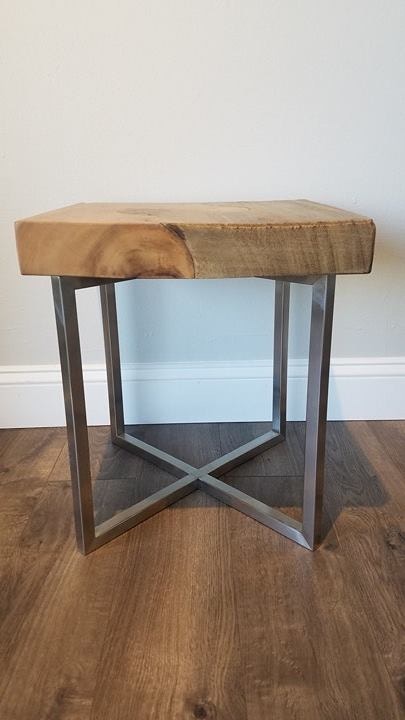 It is crafted of suar wood, metal and glass.