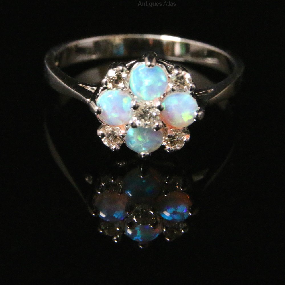 White Gold Opal And Diamond Engagement Ring / Vintage 14k Gold Opal & Diamond Engagement Ring by ... - 10k white gold aa opal white diamond 5 stone ring gift ct 0.2 h color i3 clarity.. We've gathered our favorite opal rings for you to browse and fall in love with. Opal's natural play of colour is accentuated by the sparkle of two brilliant diamonds in this oval gemstone ring set in 18k white gold. Vintage natural opal engagement ring art deco rose gold ring oval cut bridal ring moissanite ring diamond prong set ring anniversary ring. The white gold setting has beautiful. While perfect for special occasion wear, opals are a softer gemstone and not recommended for daily wear.
